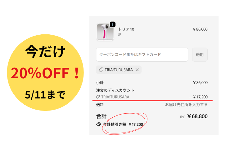 トリアビューティー様より当サイト向けに10%OFF→期間限定20%OFFの割引コード【TRIA!TURUSARA】をご提供いただきました!この割引コードを入力すると今だけ20%OFFで購入できます(4/25~5/11まで)。★購入はこちら![]()